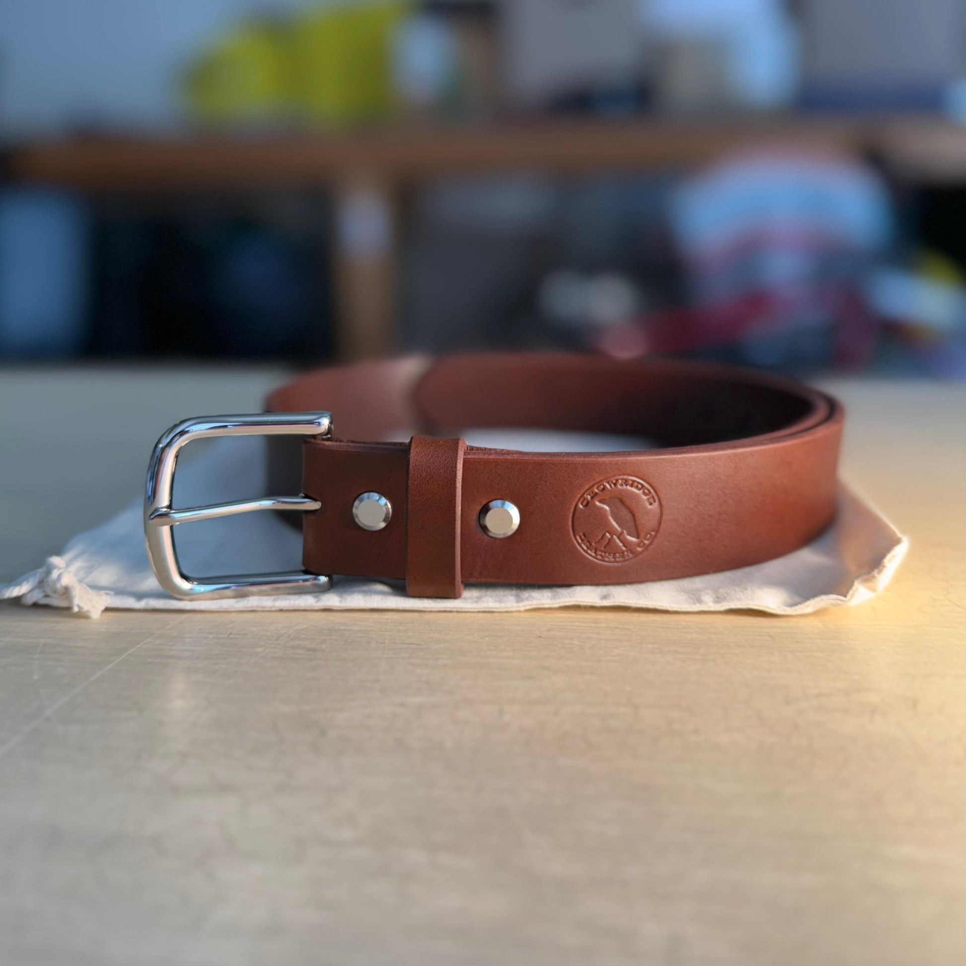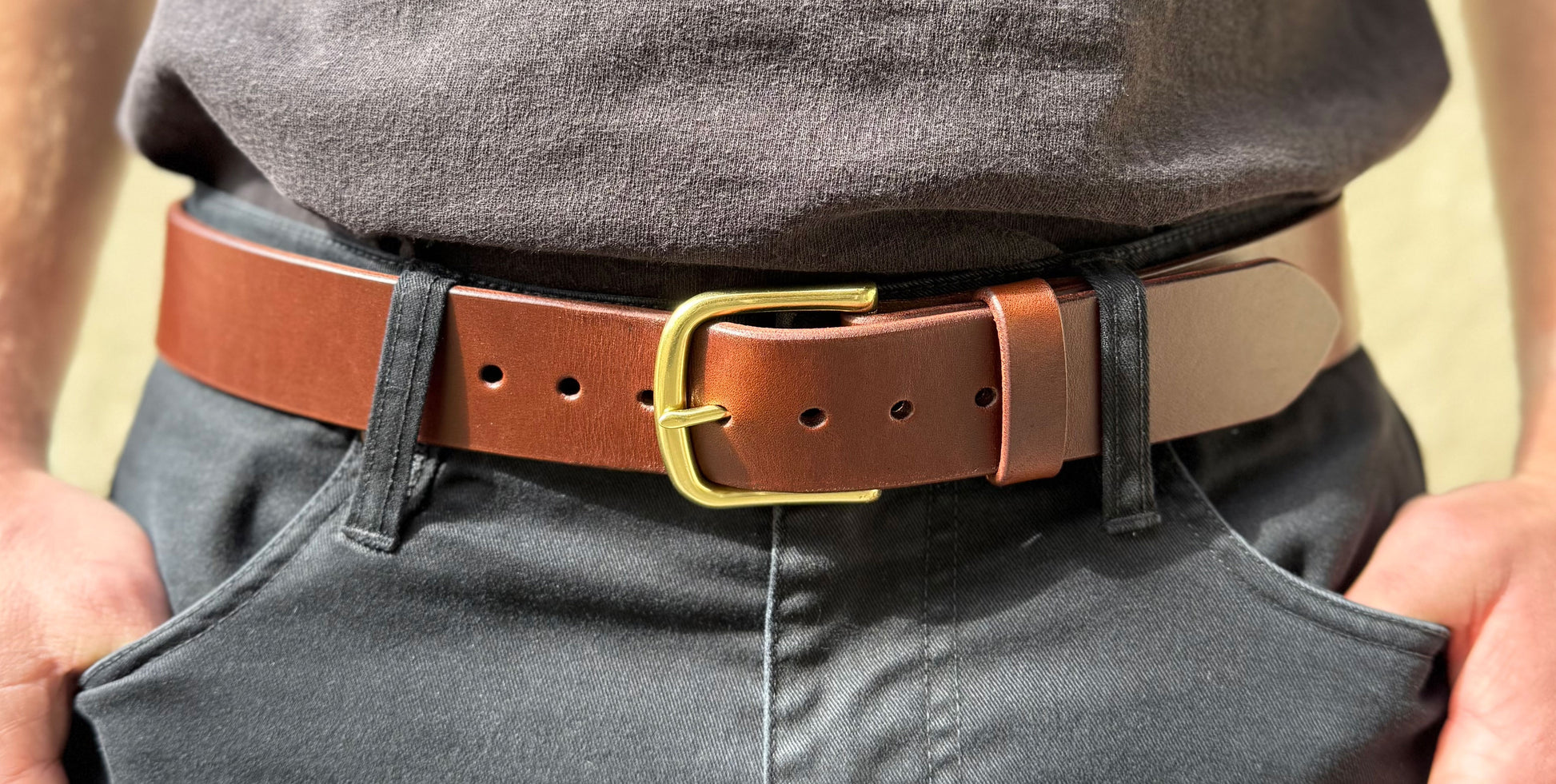 Full-grain leather belt made from thick 11 oz cowhide and solid brass hardware, handmade in the USA. A classic, all-around belt that will last you a lifetime.